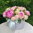 17 белых пионов в шляпной коробке