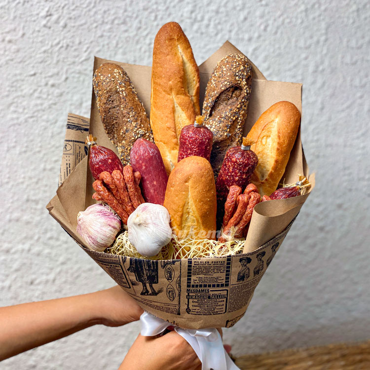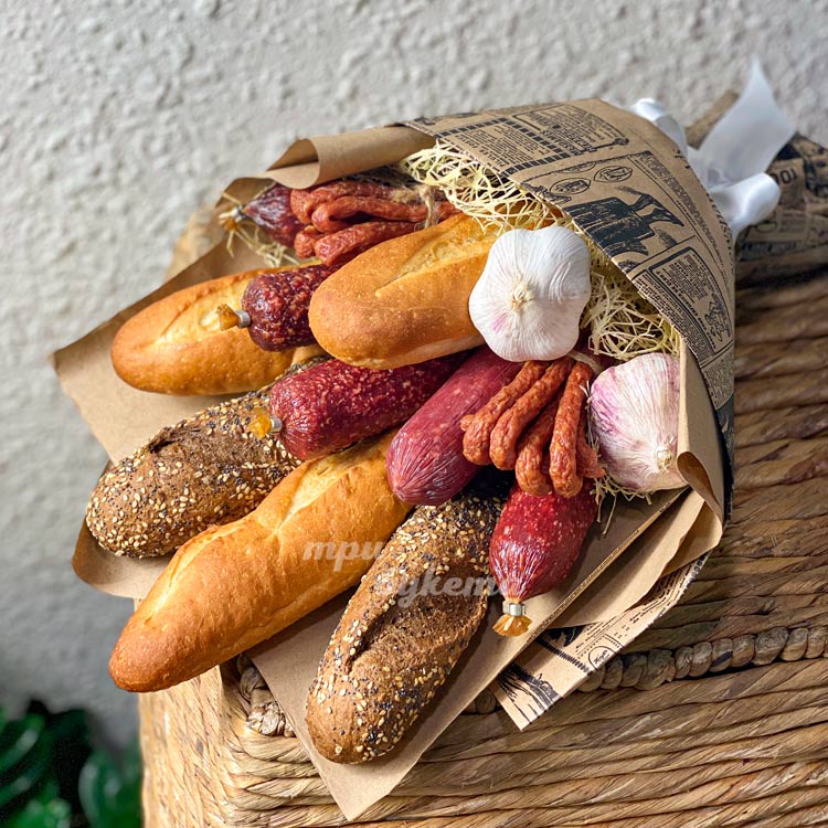 Букет из багетов, колбас и чеснока