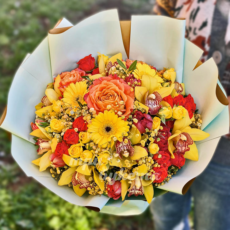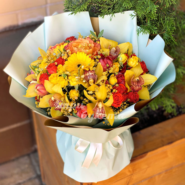 Букет из желтых орхидей, роз и гербер
