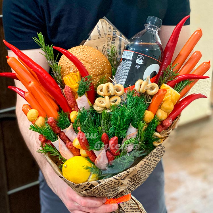 Букет с сосисками, сыром и напитком