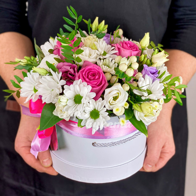 Коробочка с белым гиперикумом и хризантемами