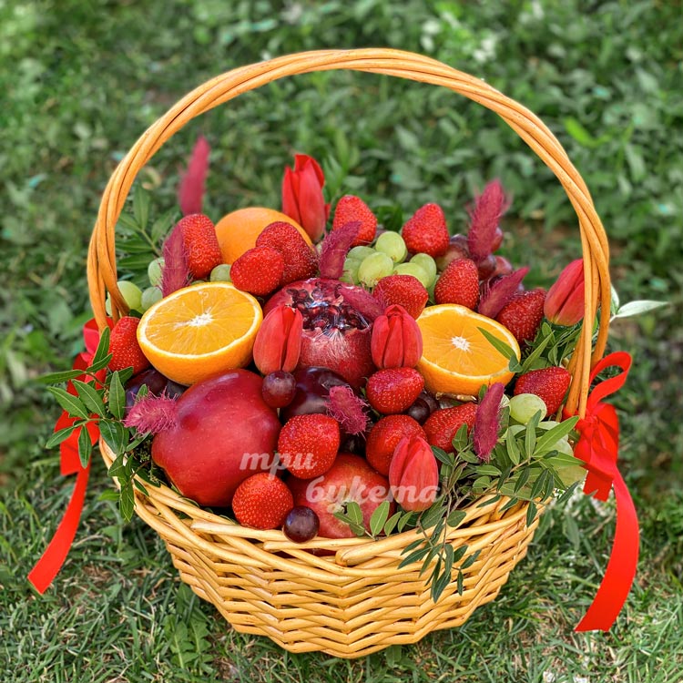 Корзина фруктов с красными тюльпанами