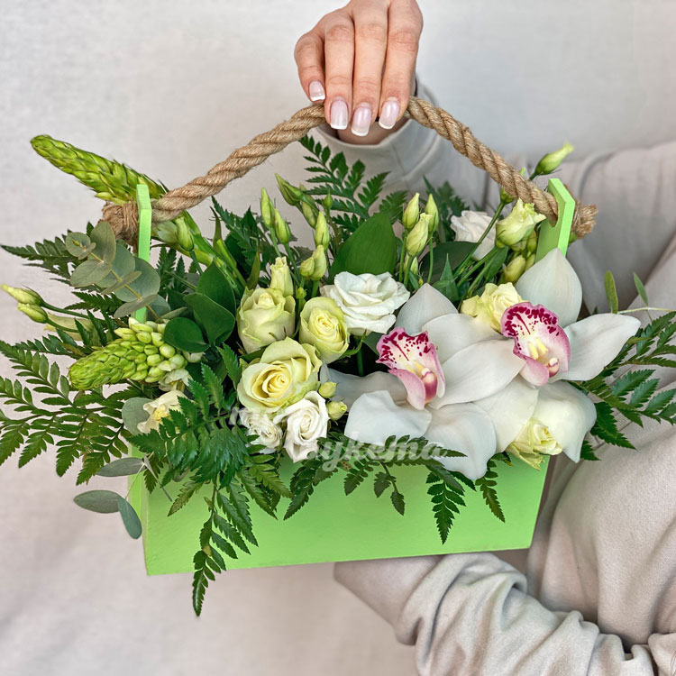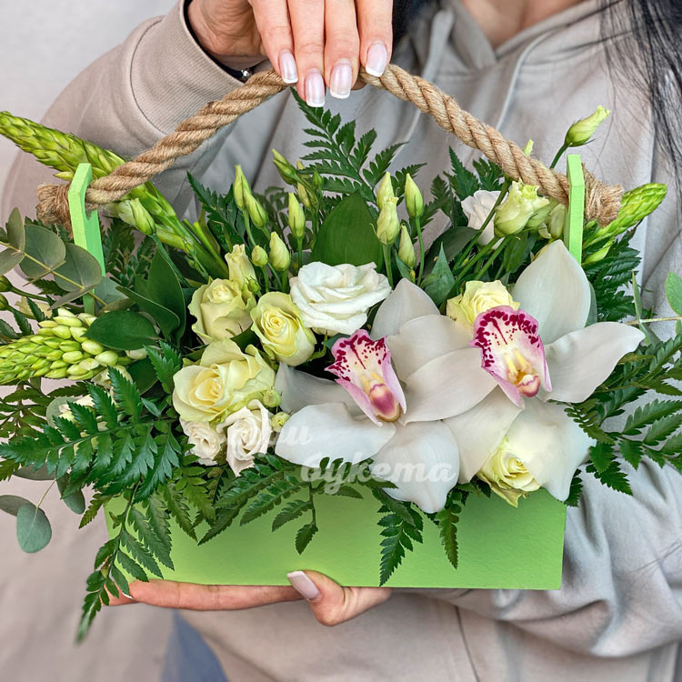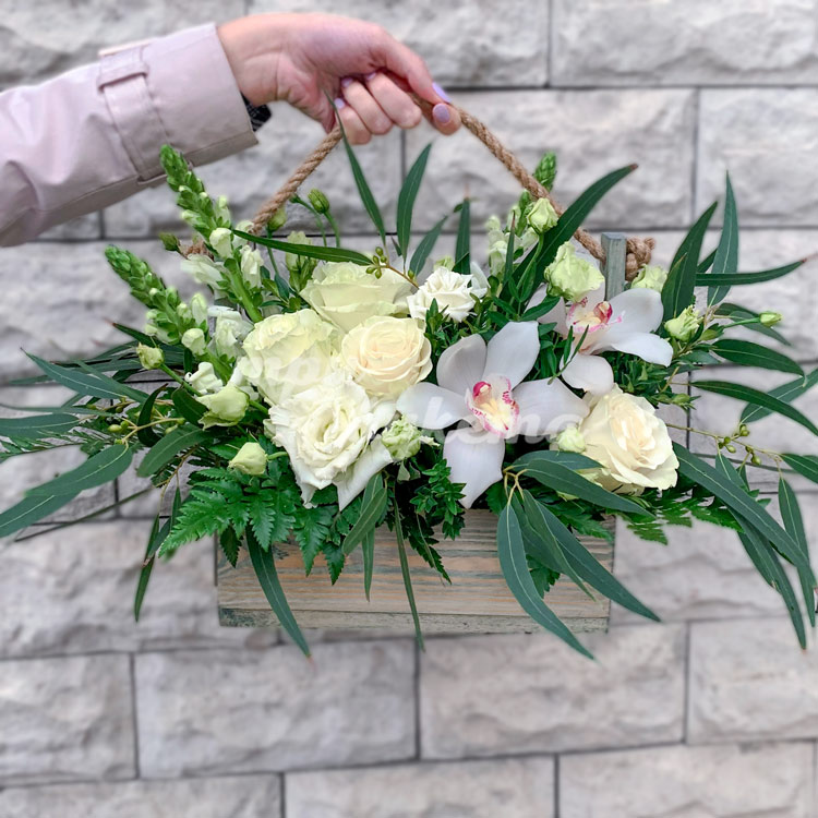 Орхидеи, розы и эустомы в ящичке