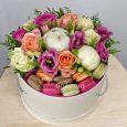 Розовые розы и хризантемы в коробке