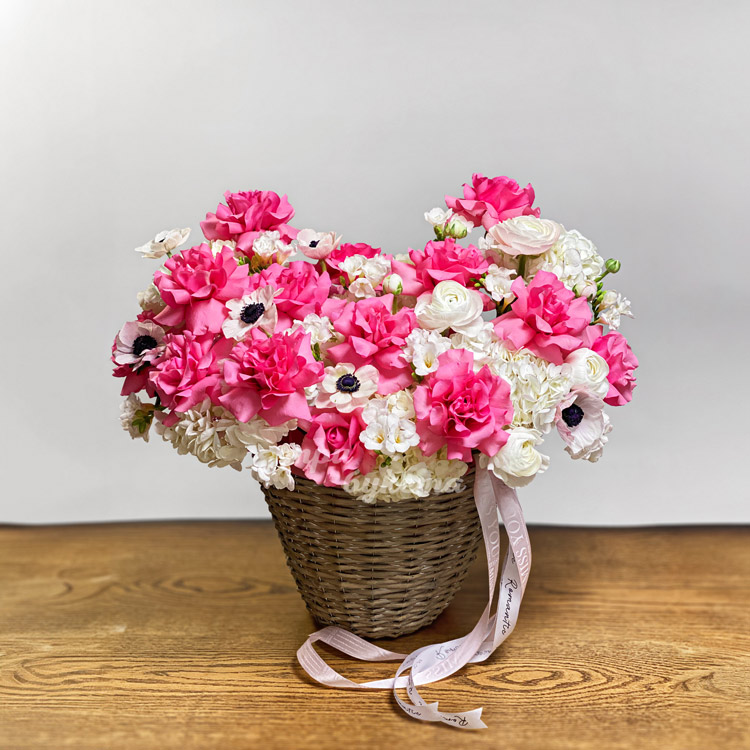 Розовые розы с белыми анемонами в корзине