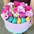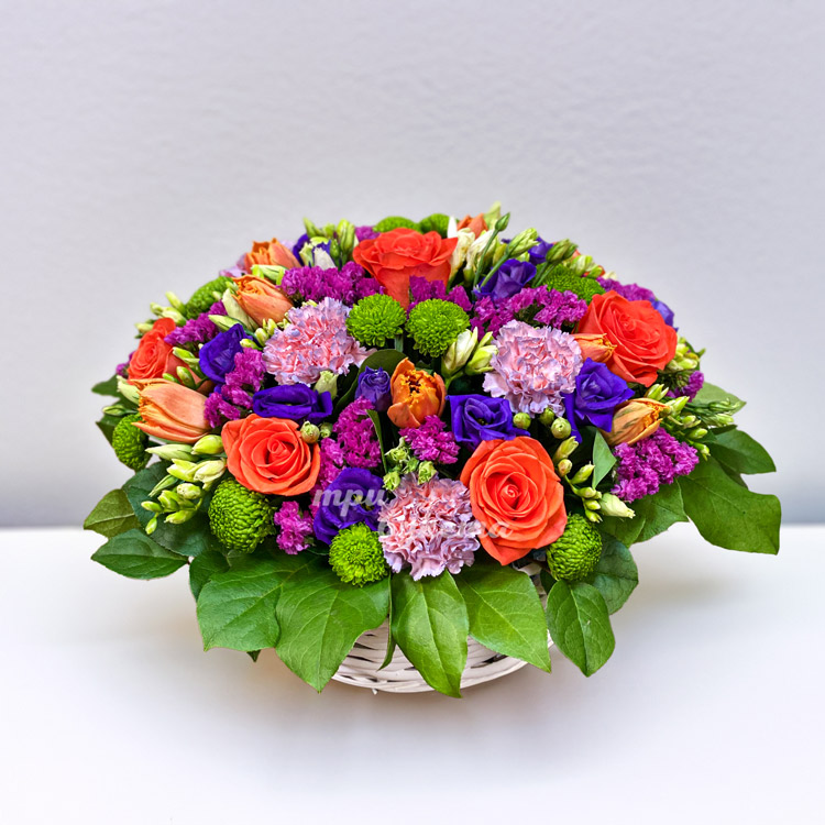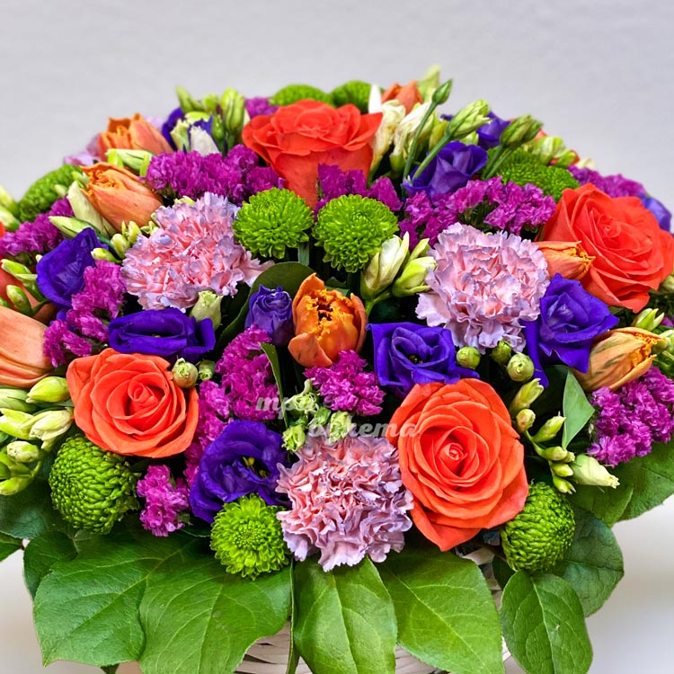 Яркая корзина гвоздик, роз и тюльпанов